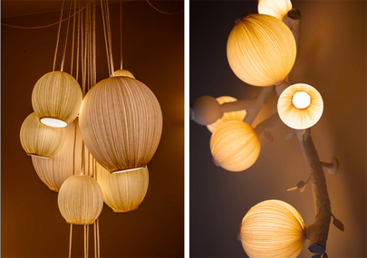 Otra intervención fascinante proviene de Papier à Êtres, el dúo de artistas conformado por Sophie Mouton Perrat y Frédéric Guibrénet, quienes han elevado el arte del papel a una nueva dimensión. Sus lámparas de papel, delicadas y etéreas, flotan en el aire como si fueran capullos suspendidos en el tiempo. “Trabajar con papel es como domar el viento”, comenta Sophie. “Cada pliegue, cada curva, es una exploración de la fragilidad y la resistencia.”